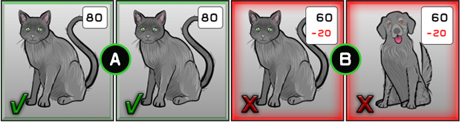 Each card starts with a possible 100 points. Every time an unsuccessful pair has been flipped (B), each card has 20 points deducted from thier score. The cards can never have below 10 points. In this scenario (B), the cards had 80 points and lost 20 points each, and thier new totals are 60. Every time a successful pair has been flipped (A), both card's scores are added to the player's score. In this scenario (A), the cards had 80 points each, and the player has gained 160 points.