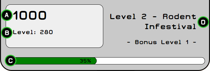 To progress, you will need to have a level score that is at or over the level threshold. (Bonus levels do not have a threshold). Each level threshold will be shown at the beginning of the level. When you start the level, the bar (C) will be yellow. When you have met or exceeded the level score, this bar will turn green, as shown below.